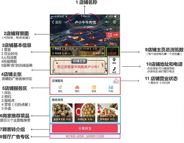 像吃耶小程序-餐厅营销系统,就帮助餐厅在微信里开了一个微信门店,通过小程序的方式很清晰的展示了餐厅11个方面,让顾客非常清楚餐厅当前情况和动态。